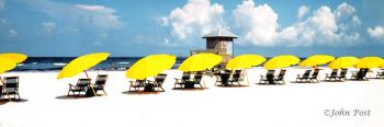 Beach Chairs Yellow Umbrellas and Lifeguard Tower